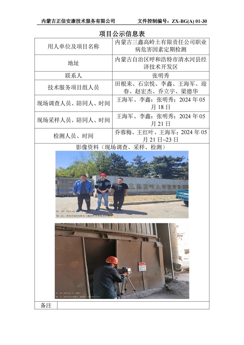 內(nèi)蒙古三鑫高嶺土有限責(zé)任公司職業(yè)病危害因素定期檢測(cè)