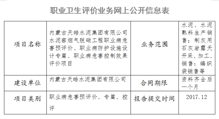 2、內(nèi)蒙古天皓水泥集團(tuán)有限公司水泥窯煙氣脫硝工程職業(yè)病危害預(yù)評(píng)價(jià)、專篇、控制效果評(píng)價(jià)項(xiàng)目