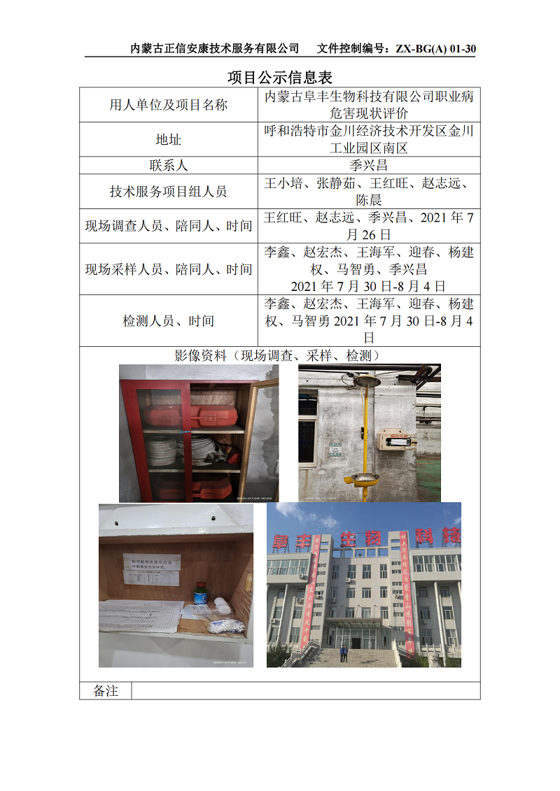 內(nèi)蒙古阜豐生物科技有限公司職業(yè)病危害現(xiàn)狀評價報告項目公示信息表