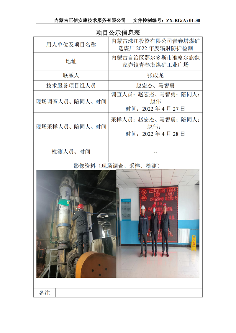 內(nèi)蒙古珠江投資有限公司青春塔煤礦選煤廠2022年度輻射防護(hù)檢測(cè)
