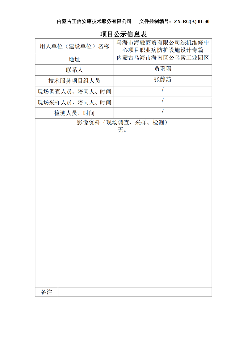 烏海市海融商貿(mào)有限公司綜機(jī)維修中心項(xiàng)目職業(yè)病防護(hù)設(shè)施設(shè)計(jì)專篇項(xiàng)目信息公示