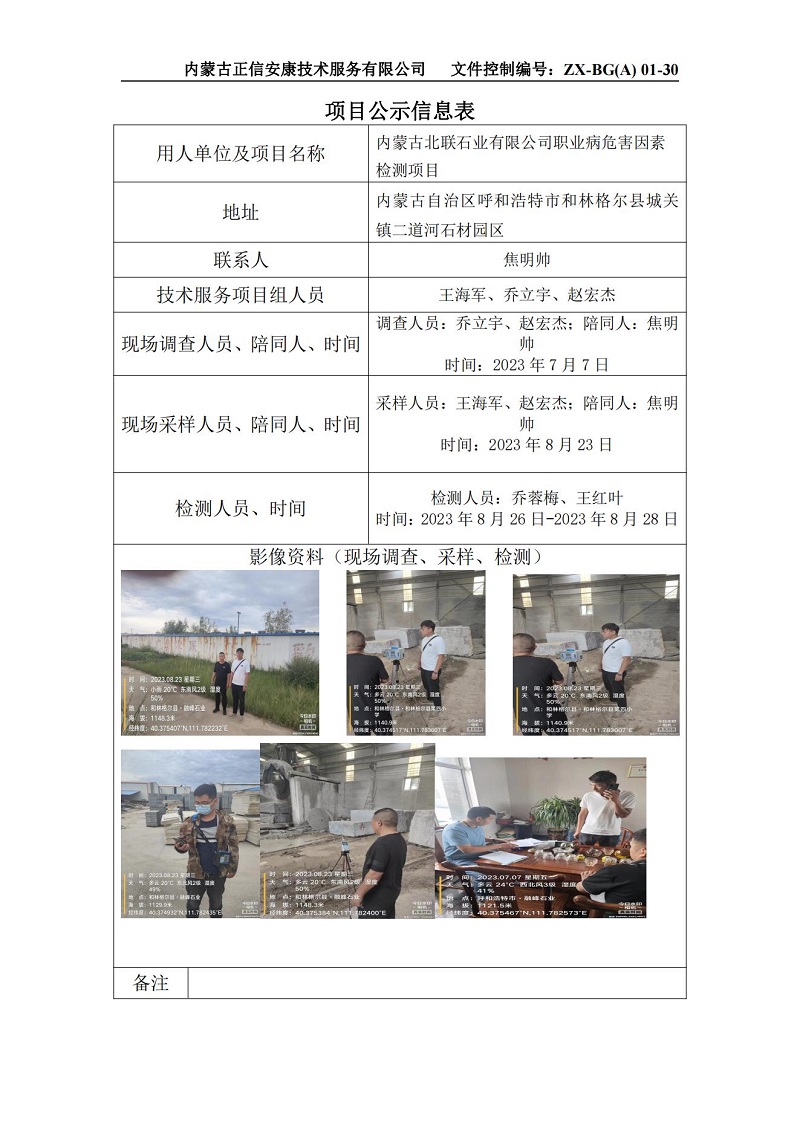 內(nèi)蒙古北聯(lián)石業(yè)有限公司職業(yè)病危害因素檢測(cè)項(xiàng)目公示信息表_