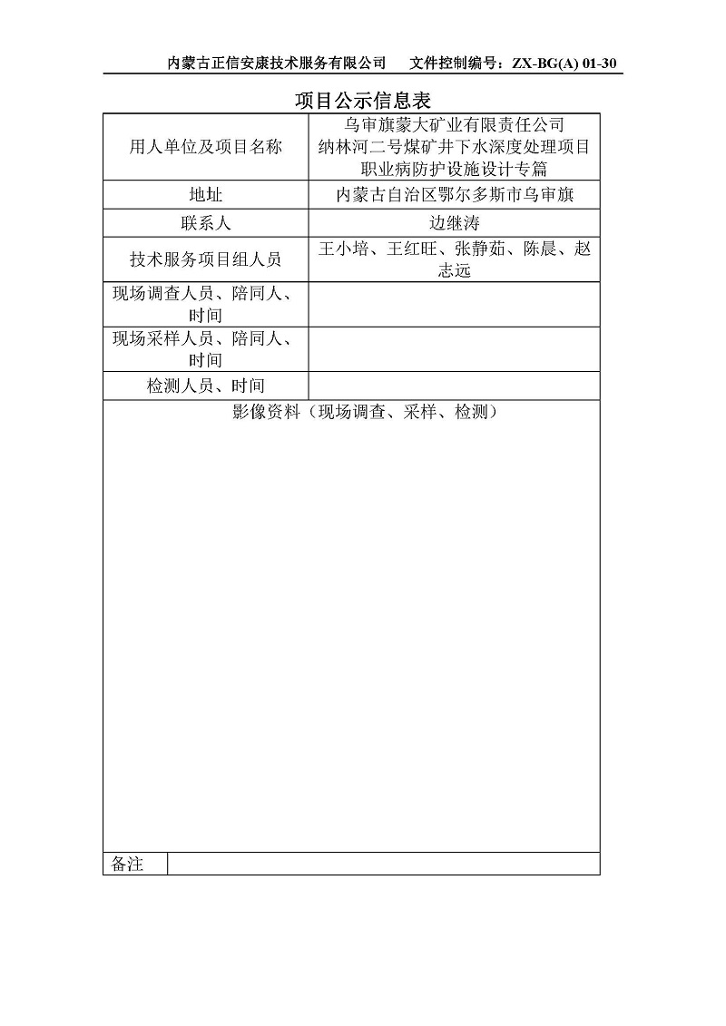 烏審旗蒙大礦業(yè)有限責(zé)任公司納林河二號煤礦井下水深度處理項(xiàng)目職業(yè)病防護(hù)設(shè)施設(shè)計(jì)專篇信息公示表