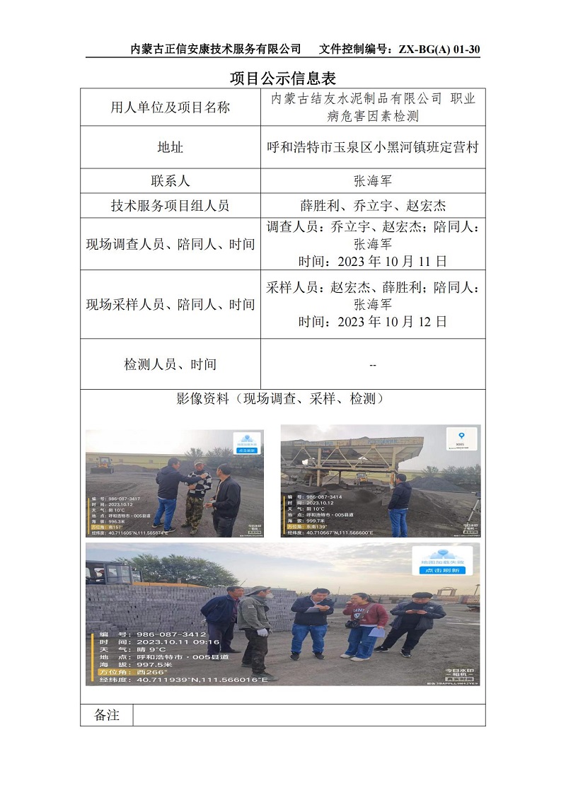 內(nèi)蒙古結(jié)友水泥制品有限公司 職業(yè)病危害因素檢測(cè)項(xiàng)目公示信息表