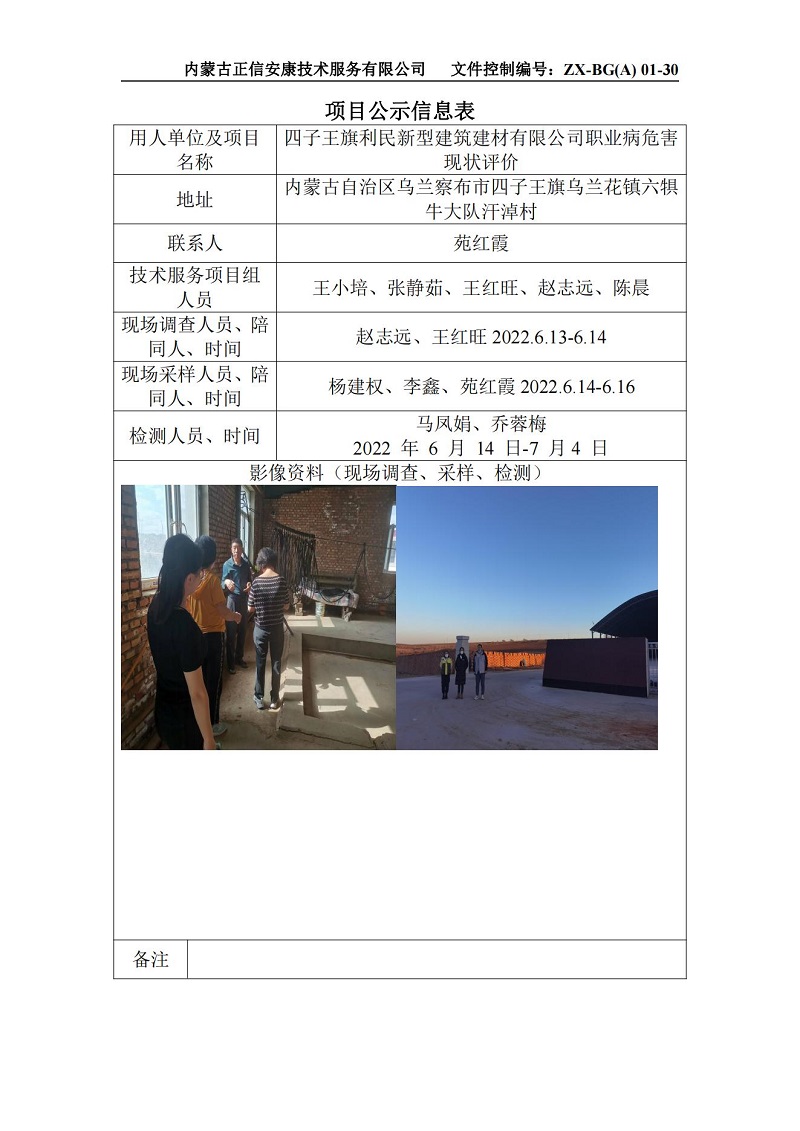 四子王旗利民新型建筑建材有限公司職業(yè)病危害現(xiàn)狀評(píng)價(jià)項(xiàng)目公示信息表