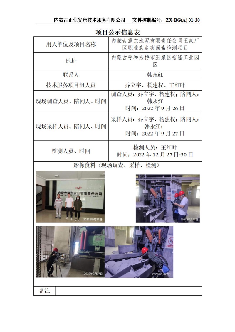內(nèi)蒙古冀東水泥有限責(zé)任公司玉泉廠區(qū)職業(yè)病危害因素檢測(cè)項(xiàng)目公示信息表
