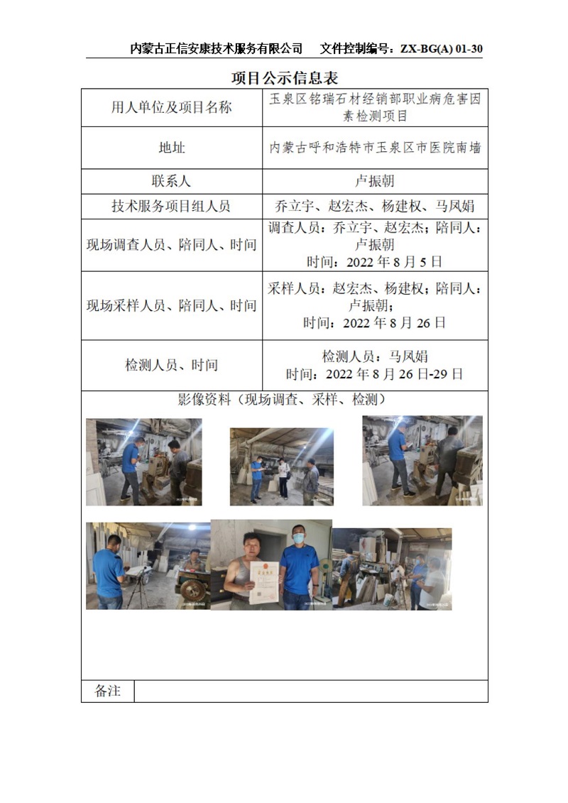 玉泉區(qū)銘瑞石材經(jīng)銷(xiāo)部職業(yè)病危害因素檢測(cè)項(xiàng)目公示信息表