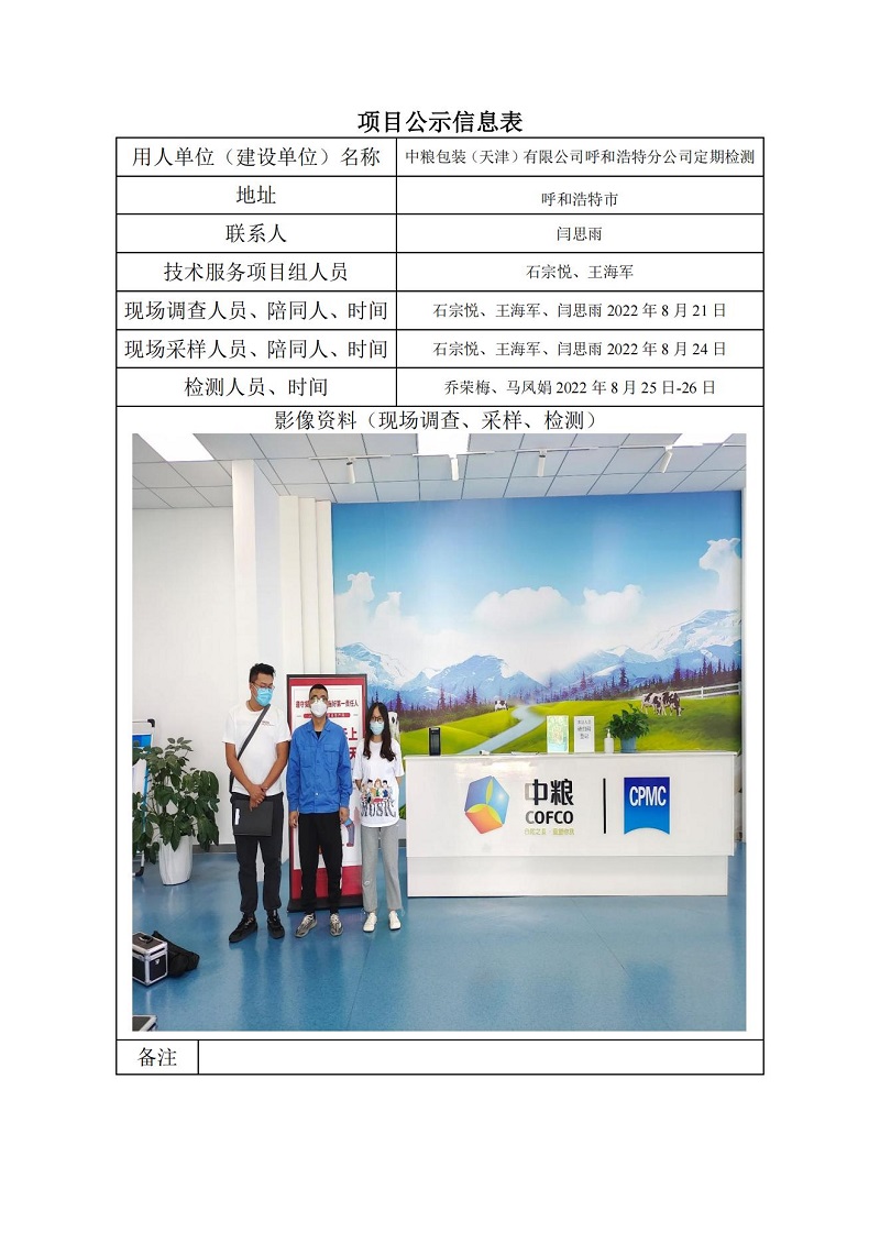 中糧包裝(天津)有限公司呼和浩特分公司定期檢測項目公示信息表