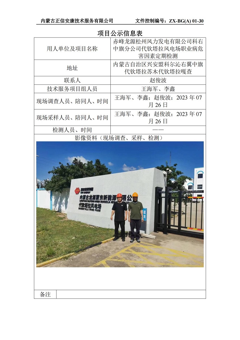 赤峰龍?jiān)此芍蒿L(fēng)力發(fā)電有限公司科右中旗分公司代欽塔拉風(fēng)電場(chǎng)職業(yè)病危害因素定期檢測(cè)