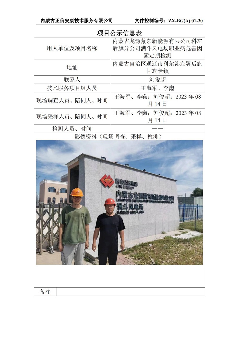內(nèi)蒙古龍?jiān)疵蓶|新能源有限公司科左后旗分公司滿斗風(fēng)電場職業(yè)病危害因素定期檢測