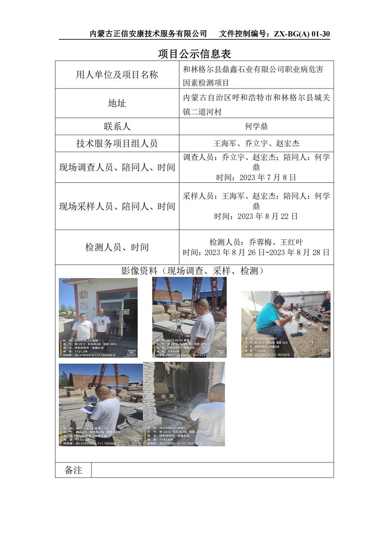 和林格爾縣鼎鑫石業(yè)有限公司職業(yè)病危害因素檢測項目公示信息表