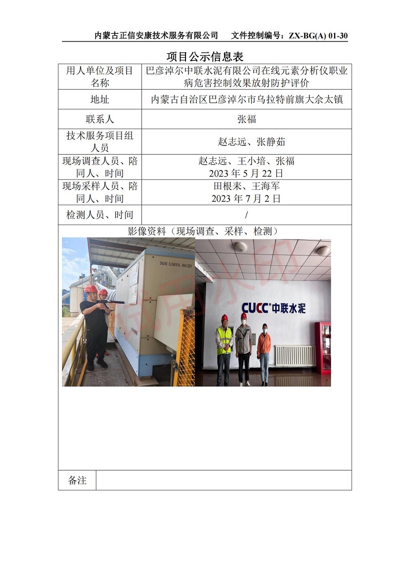 巴彥淖爾中聯(lián)水泥有限公司在線元素分析儀職業(yè)病危害控制效果放射防護(hù)評(píng)價(jià)-項(xiàng)目公示信息表