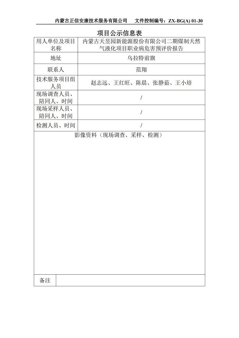內(nèi)蒙古天昱園新能源股份有限公司二期煤制天然氣液化項目職業(yè)病危害預評價報告-項目公示信息表