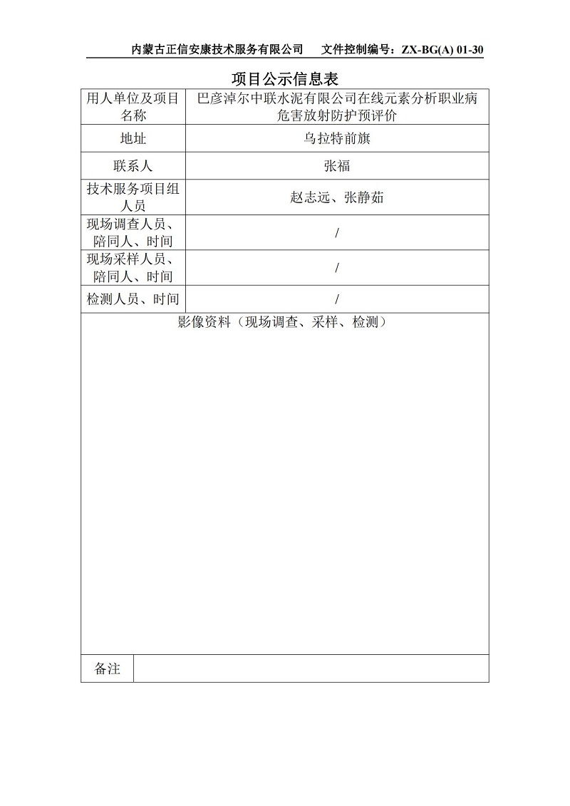 巴彥淖爾中聯水泥有限公司在線元素分析職業(yè)病危害放射防護預評價-項目公示信息表