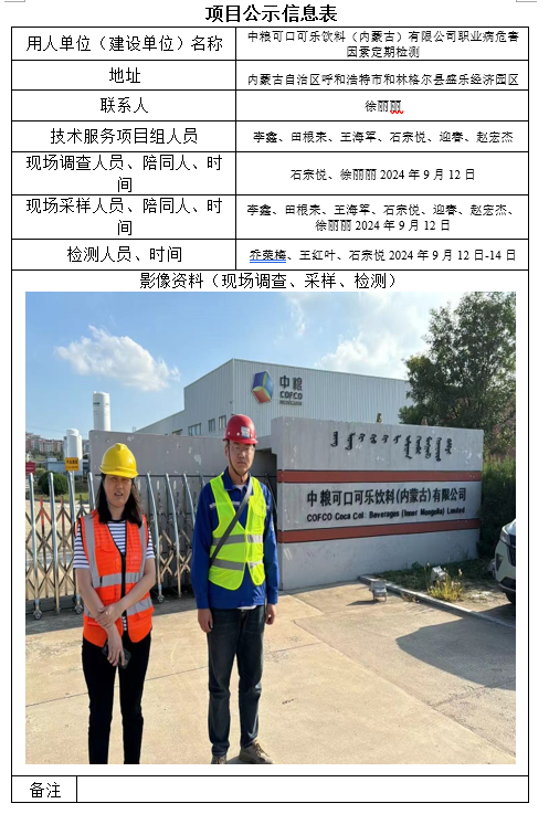 中糧可口可樂飲料(內(nèi)蒙古)有限公司職業(yè)病危者因素定期檢測