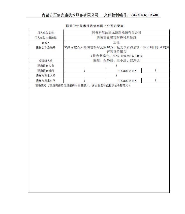 龍源內蒙古赤峰阿魯科爾沁旗10萬千瓦光伏防沙治沙一體化項目 職業(yè)病危害預評價報告
