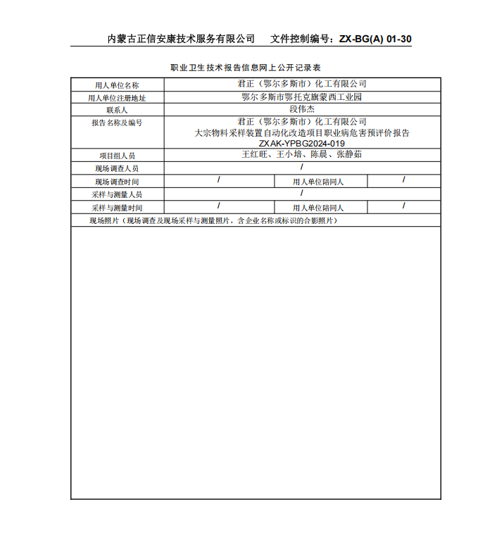 君正(鄂爾多斯市)化工有限公司 大宗物料采樣裝置自動(dòng)化改造項(xiàng)目職業(yè)病危害預(yù)評(píng)價(jià)報(bào)告