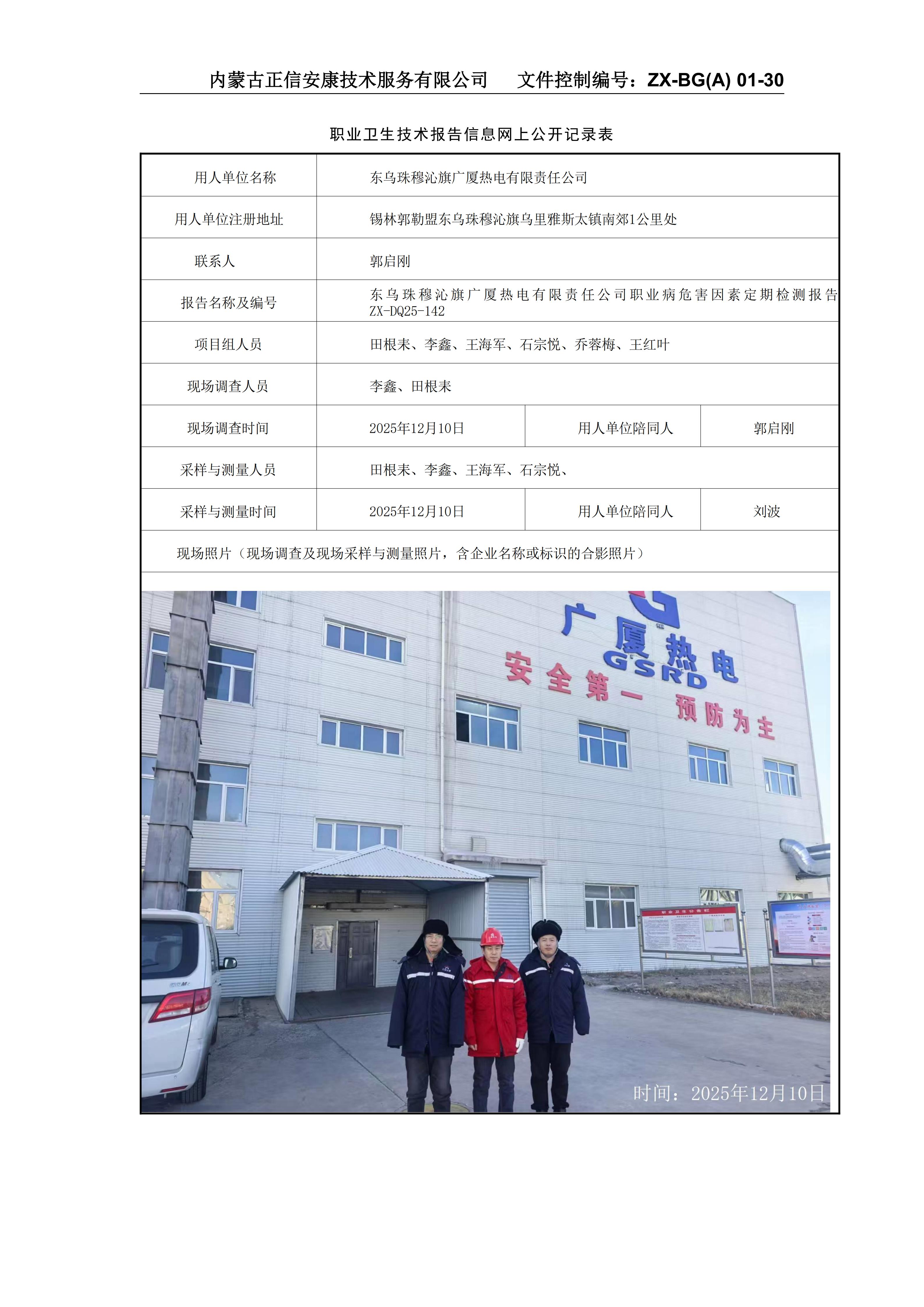 東烏珠穆沁旗廣廈熱電有限責任公司職業(yè)病危害因素定期檢測報告